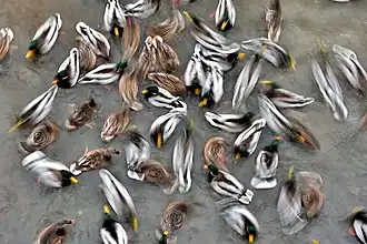 Behavior of a flock of mallard ducks when feeding visitors to the park