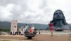 The governor of Tamil Nadu state, the Indian minister of tourism, and the yoga guru Jaggi Vasudev promoting yoga in India on the 3rd International Day of Yoga in 2017 at the Isha Foundation, Coimbatore. A large statue of the god Shiva as Adiyogi (the first yogi) is in the background.