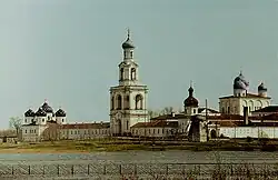 The St. George's (Yuriev) Monastery (Russian: Юрьев монастырь, romanizedYur'ev monastyr') is usually cited as Russia's oldest monastery. It stands in 5 kilometers south of Novgorod on the left bank of the Volkhov River near where it flows out of Lake Ilmen. The monastery used to be the most important in the medieval Novgorod Republic. It is part of the World Heritage Site named Historic Monuments of Novgorod and Surroundings.