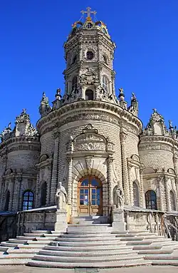 The Church of the Theotokos of the Sign (Dubrovitsy), or The Church of the Holy Sign of the Mother of God in Dubrovitsy, (Russian: Церковь Зна́мения Пресвятой Богоро́дицы в Дубровицах) is a Russian Orthodox church in the village of Dubrovitsy, Podolsk Urban Okrug, Moscow Oblast, Russia. Dubrovitsy is located about 36 km South of Moscow (16 km from the Moscow Ring Road; along the highway Podolsk-Dubrovitsy 6 km). The Dubrovitsy Estate used to belong to the noble families of Morozov, Golitsyn and Dmitriev-Mamonov. The estate consists of a palace, a Horse yard with Gothic gate, several outbuildings, a church and a park. The church is famous for its unique architecture, unusual to Russian architecture, as well as a mysterious history.