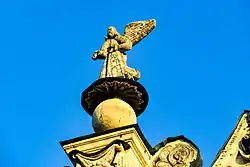 The cornice of the church is richly decorated; especially luxurious is its frieze entirely covered with ornaments. False windows are installed on the pediments around the entire circumference of the church. There are four small figures of Angels above each false window in the attic. Statues of Cherubs on ball pedestals are located between the false windows. These eight Cherubs installed on the roof of the church hold the tools of Christ's Passions: Spear, Ladder, Cross, Nails, Crown of Thorns, Sponge, etc.[44]
